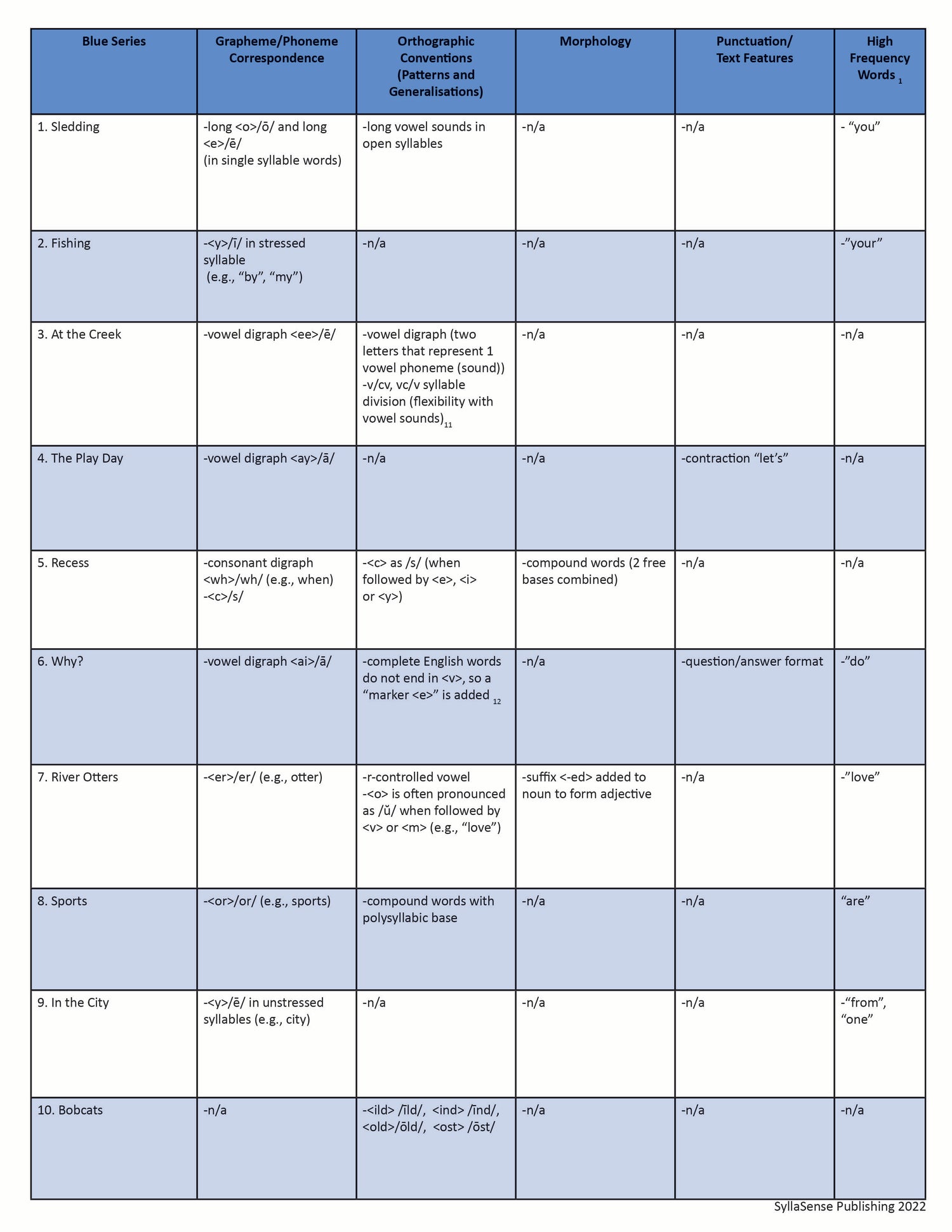 After much deliberation, we have moved away from using syllable types as the main structure of our series. Although syllable types are still very useful for students to learn, we’ve discovered that it doesn’t always make sense (in the context of decodable books) to cover all concepts within a syllable type before moving on to the next syllable type. For instance, some vowel teams such as <ee> are very regular and predictable and would make sense to include near the beginning of the series. Others, such as <ea>, have multiple sounds and would fit better later on in the series. Moving away from syllable types has allowed us to more effectively cluster concepts from “simple” to “complex”, and we feel it will improve the flow of the series.